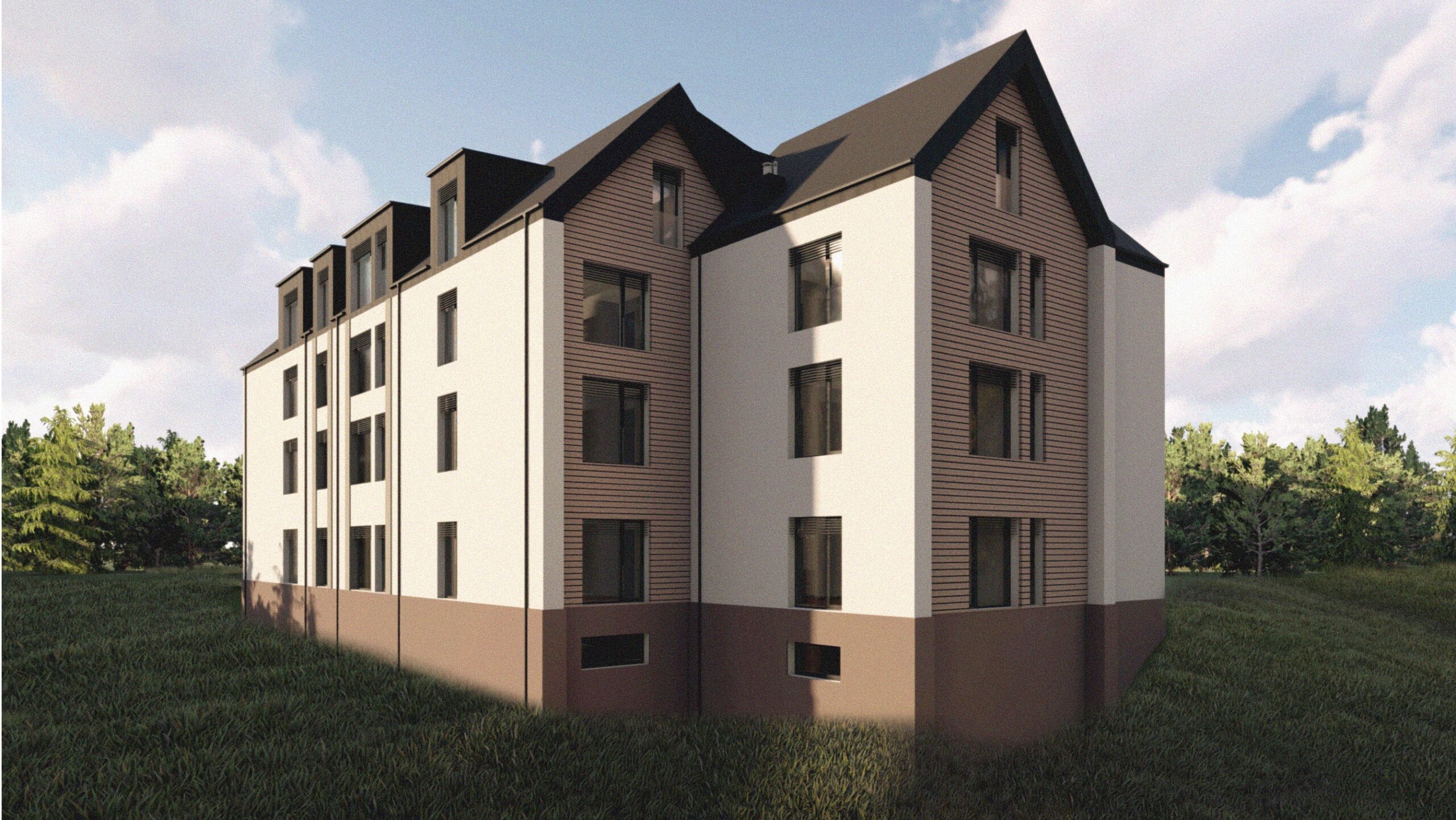 Na základě požadavků investora byla navržena novostavba bytového domu v obci Horoměřice, okres Praha-západ. Cílem bylo navrhnout stavbu, která svým tvarovým řešením vhodně využije svažitost stávajícího terénu a zároveň nenaruší charakter okolní venkovské zástavby. Navržená stavba obsahuje 2 suterénní podlaží a 4 nadzemní podlaží. Suterénní podlaží slouží pro parkování a technické zázemí objektu. Příjezd do garáží je řešen moderním autovýtahem. V nadzemních podlažích jsou umístěny bytové a nebytové prostory. Bytové jednotky jsou navrženy v moderním designu, který společně s efektivně využitým prostorem vytváří ideální prostředí i pro náročné klienty. Fasády objektů jsou doplněny o strukturované omítky v imitaci dřeva. Jako střešní krytina je navržena plechová falcovaná krytina v antracitovém odstínu.